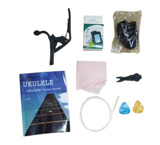 Combo Ukelele Copa Soprano con estuche,afinador, púa y capo. Colores variados.